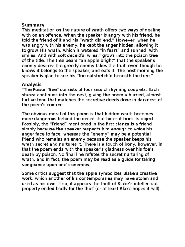 Summary Of The Poem A Poison Tree By William Blake Brainly In