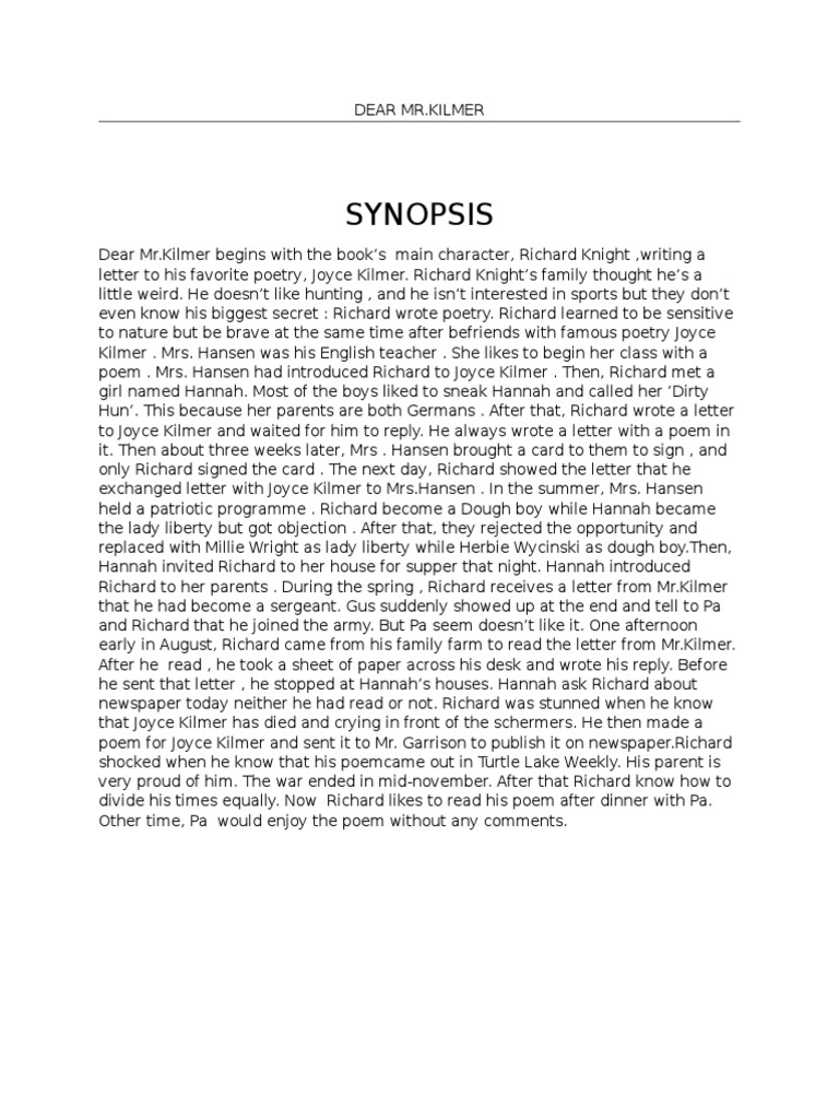Doc Dear Mr Kilmer S Synopsis Noor Baity Baharudin Academia Edu