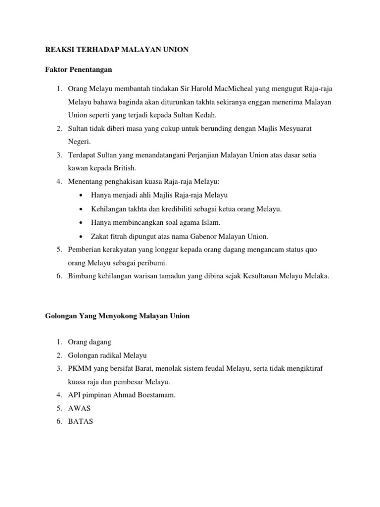 Reaksi Terhadap Malayan Union Faktor Penentangan 1