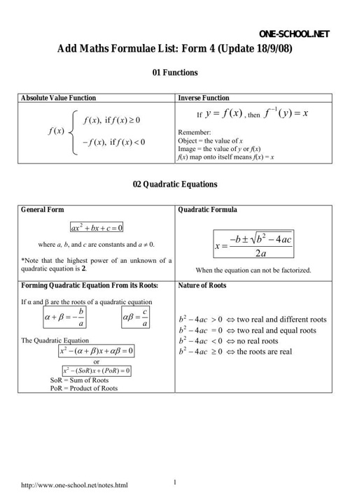 Http Www One School Net Notes Spmaddmaths Spm Add Maths Formula List Form4 Pdf