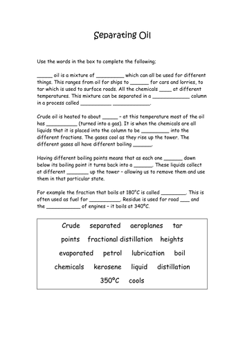Gap Fill Worksheet Question Quiz Crude Oil And Its Fractional Distillation