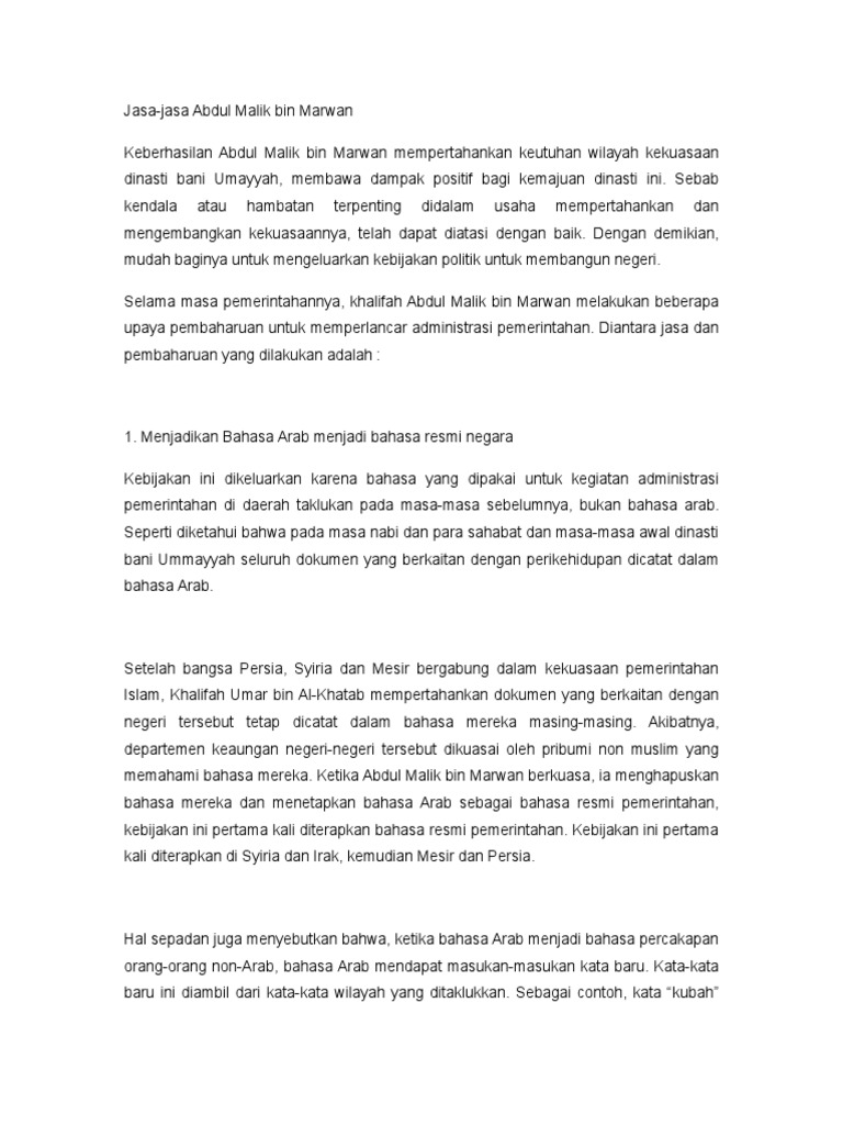 Khalifah Dari Dinasti Umayyah Yang Menjadikan Bahasa Arab Sebagai Bahasa Resmi Negara Bernama Brainly Co Id
