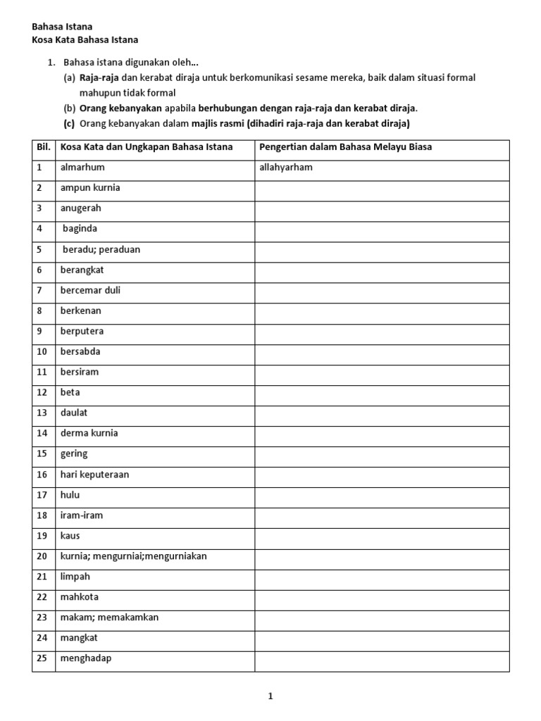 Kosa Kata Bahasa Istana Dan Maksudnya