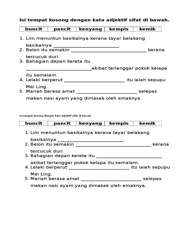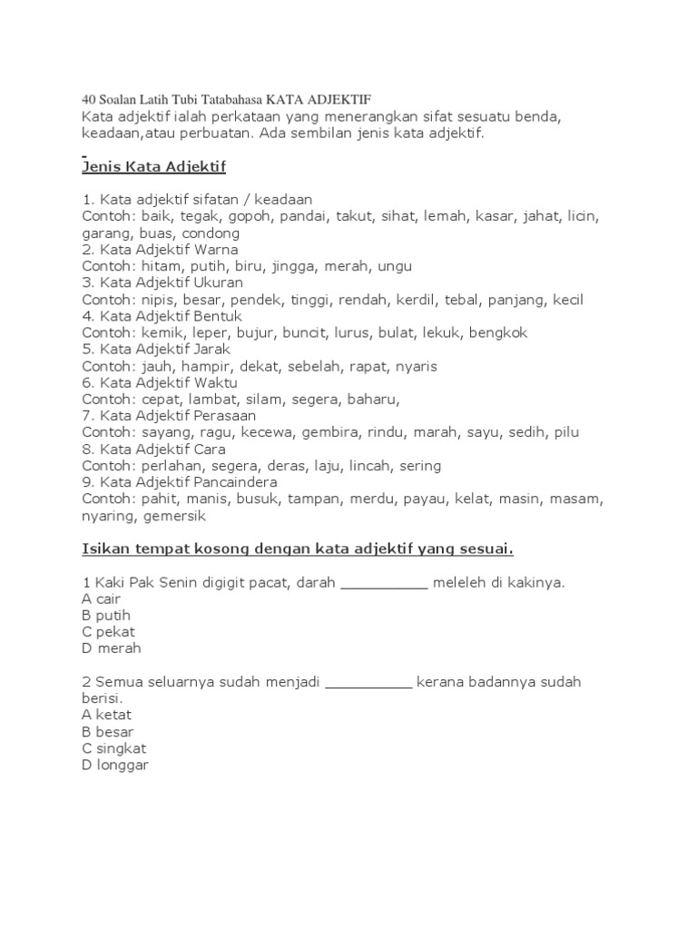 Kata Adjektif Pdf Latih Tubi Tatabahasa Kata Adjektif Kata Adjektif Kata Adjektif Ialah Perkataan Yang Menerangkan Sifat Sesuatu Benda Keadaan Atau Course Hero