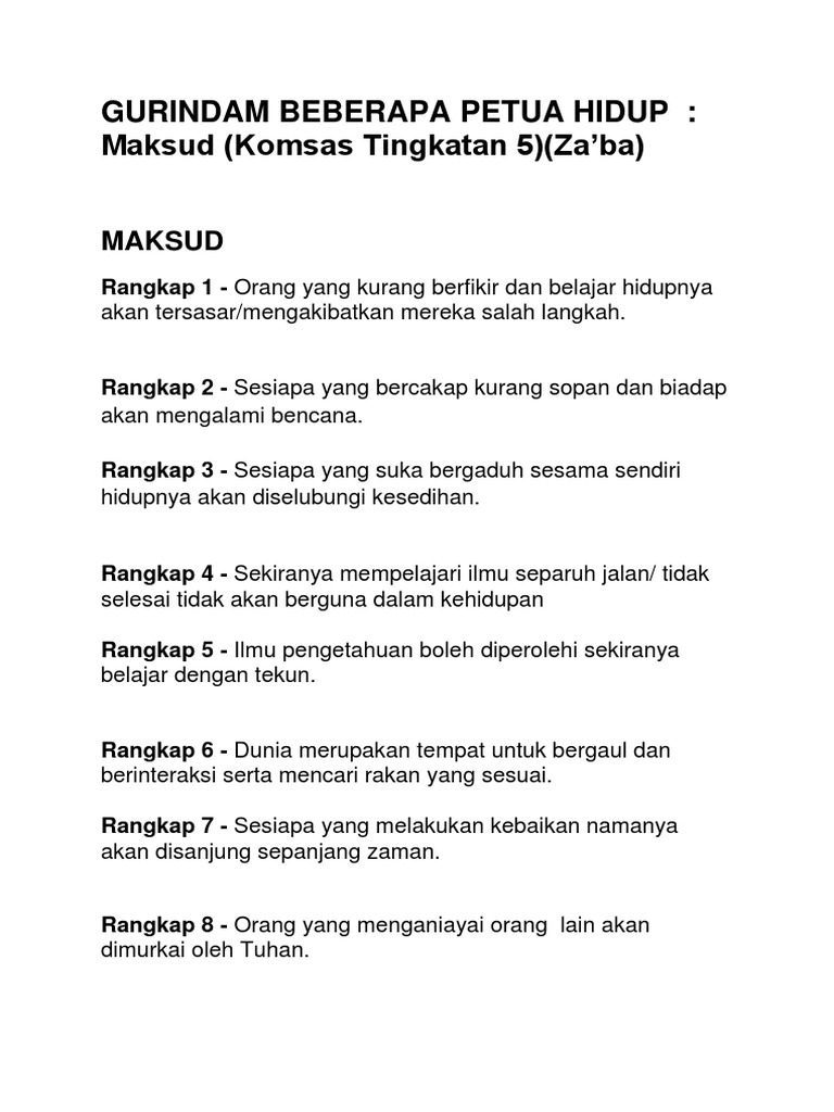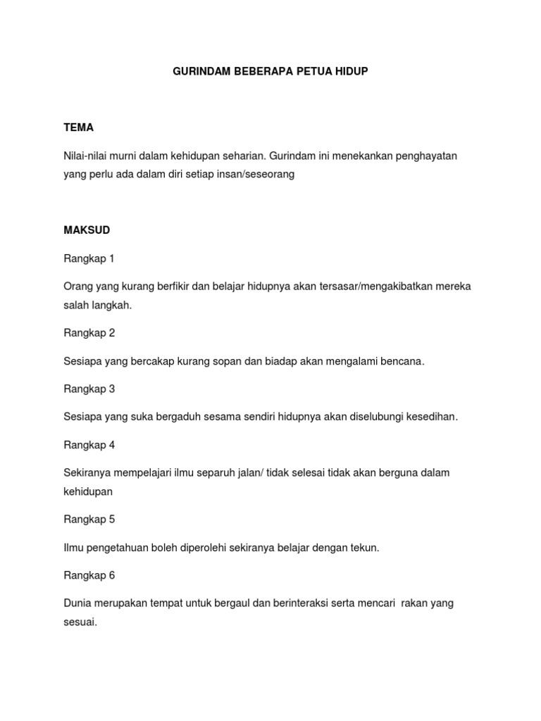 Maksud Gurindam Beberapa Petua Hidup Tingkatan 5