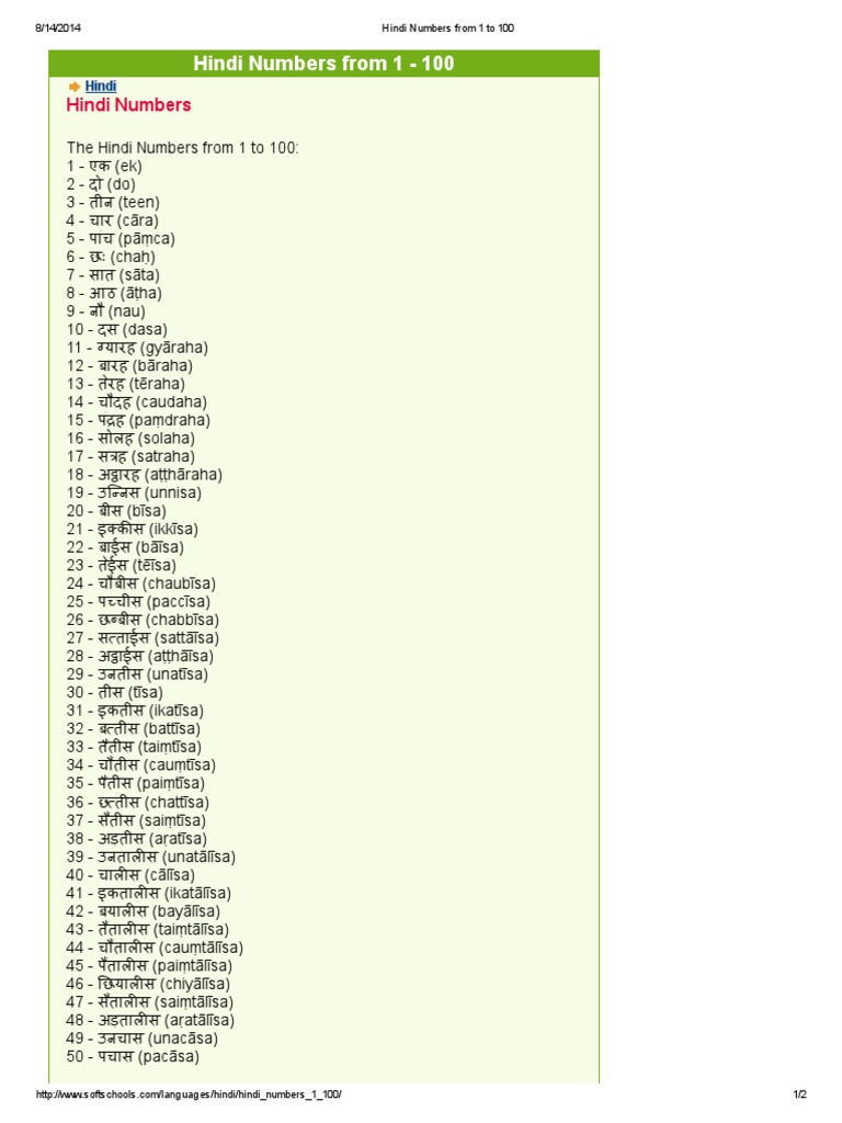 Hindi Numbers 1 100 In Words English Pronunciations Pdf Download