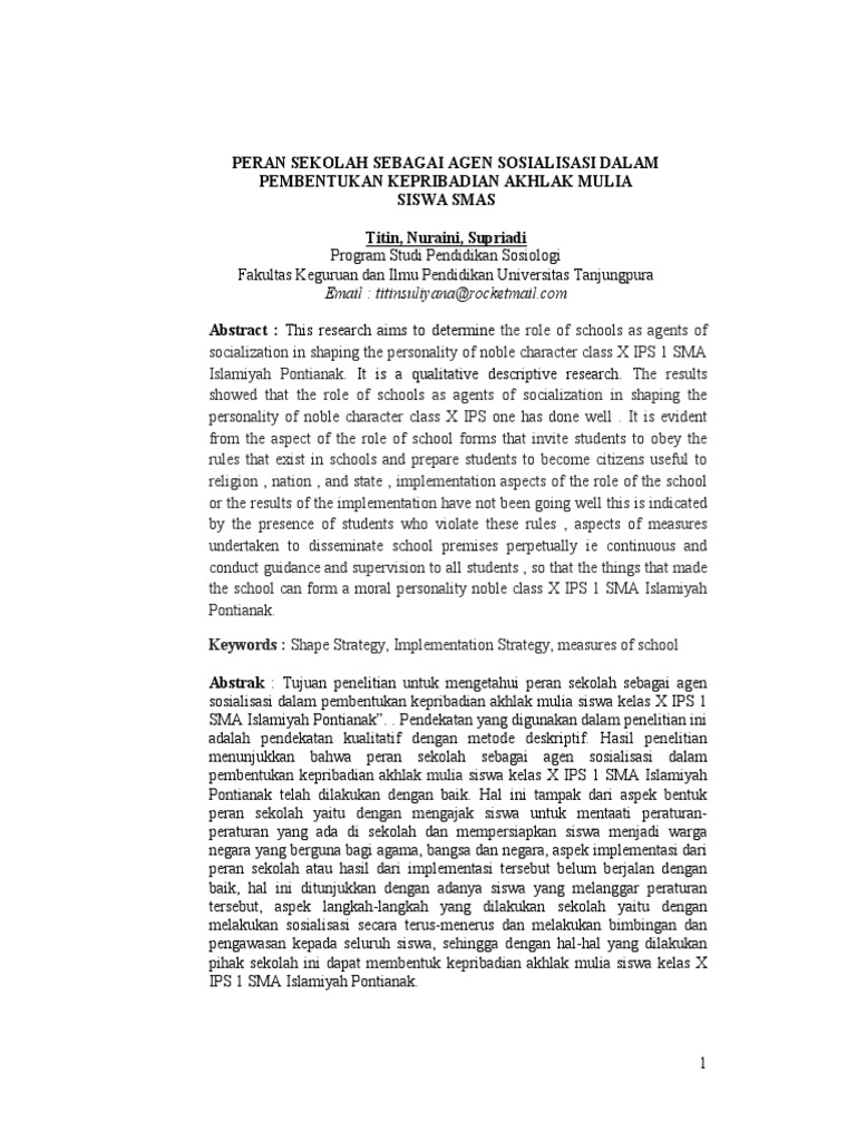 Peran Sekolah Sebagai Agen Sosialisasi Dalam Pembentukan Kepribadian Akhlak Mulia Siswa Smas Titin Nuraini Supriadi