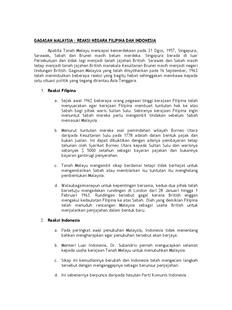 Sejarah Malaysia Tema 3 Reaksi Negara Indonesia Amp Filipina Terhadap Pembentukan Malaysia 1963 Dan Jelaskan Mengapa Timbulnya Reaksi Tersebut