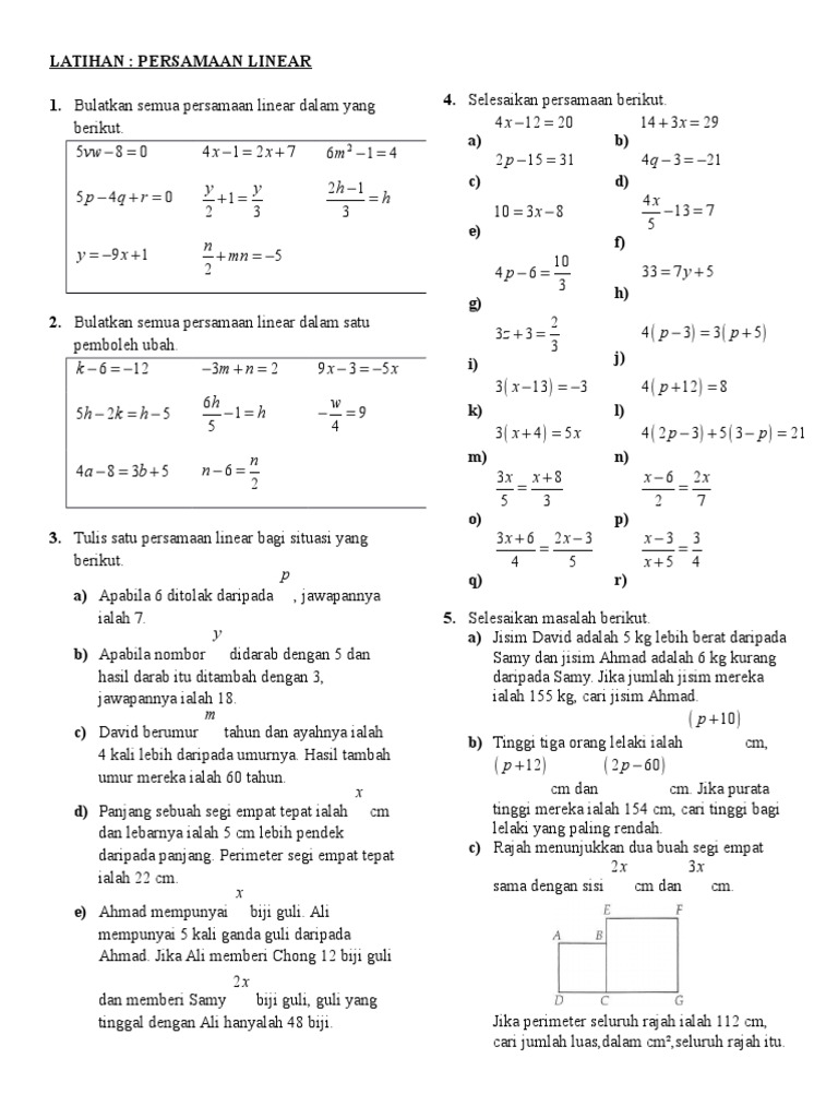 Soalan Persamaan Linear Tingkatan 1 Pdf
