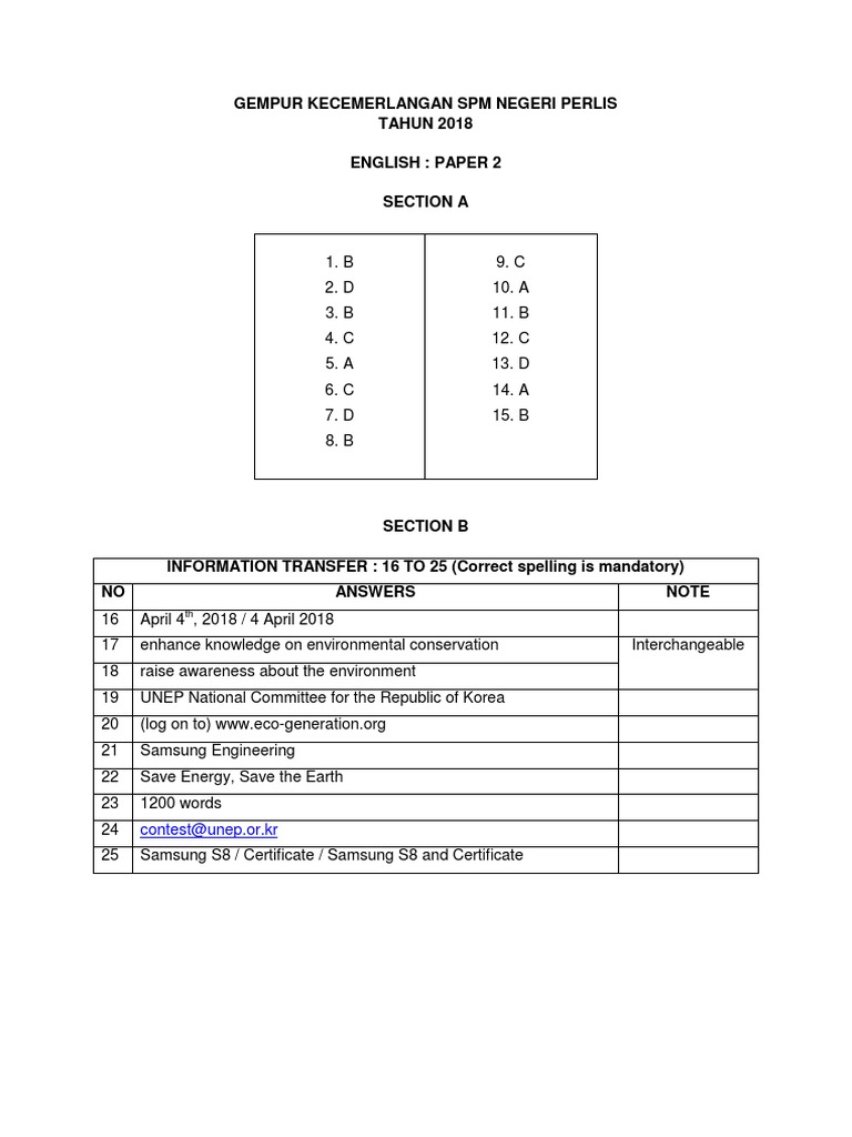 2019 Melaka English P2 Jawapan Pdf Ppd Jasin Trial Question 2019 Marking Scheme For Spm Paper 2 English 1119 2 Section A Questions Answers 1 B 2 D 3 D Course Hero